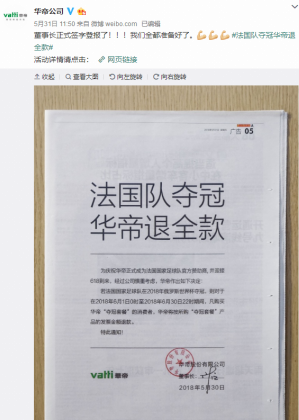 7月16日凌晨,法国队捧得大力神杯,和法国队同样高兴的当属购买华帝“冠军套餐”的消费者,因为华帝承诺“退全款”。随后,华帝也在官方微博发布“退全款流程公示”,又在社交平台上怒刷了一波存在感。