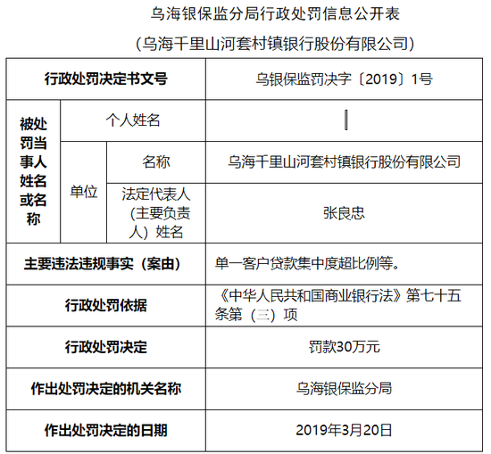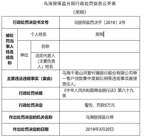 乌海银行旗下2村镇银行违法 一行长被取消任职资格5年