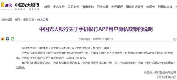 光大银行发布手机APP用户隐私政策说明:符合相关要求