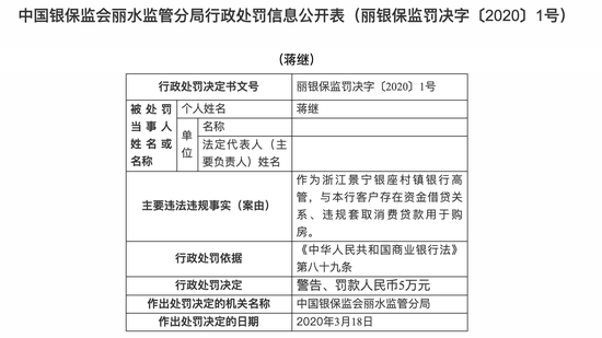 浙江景宁银座村镇银行3宗违规被罚