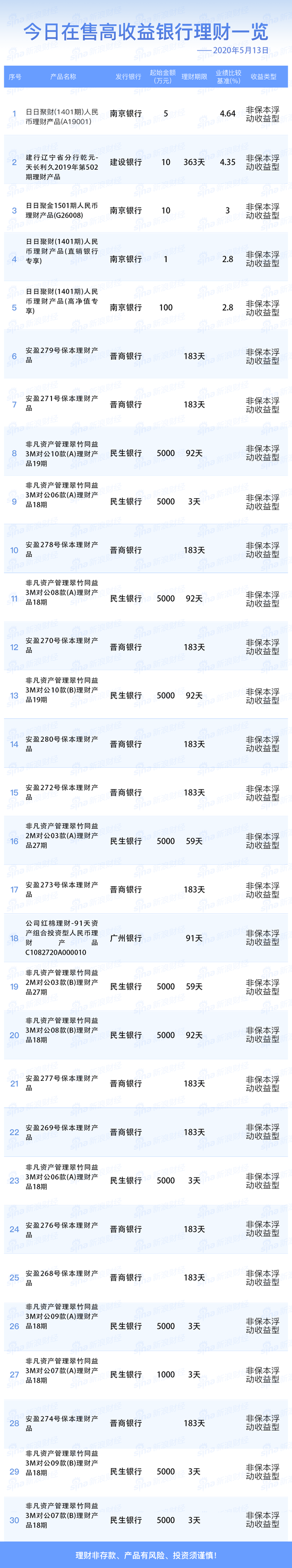 •   新浪财经消息:5月13日在售高收益银行理财产品:今日业绩比较基准在4.6%以上的银行人民币理财产品共1款。南京银行的“日日聚财(1401期)人民币理财产品(A19001)”业绩比较基准最高,为4.64%。
