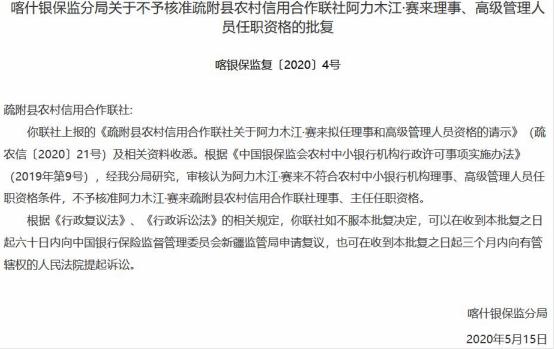 公告显示,喀什银保监分局根据《中国银保监会农村中小银行机构行政许可事项实施办法》(2019年第9号),经研究,审核认为阿力木江·赛来不符合农村中小银行机构理事、高级管理人员任职资格条件,不予核准其疏附县农村信用合作联社理事、主任任职资格。