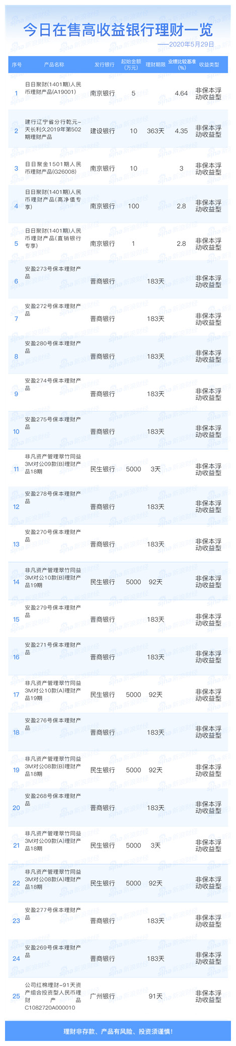 银行5月29日在售高收益理财产品