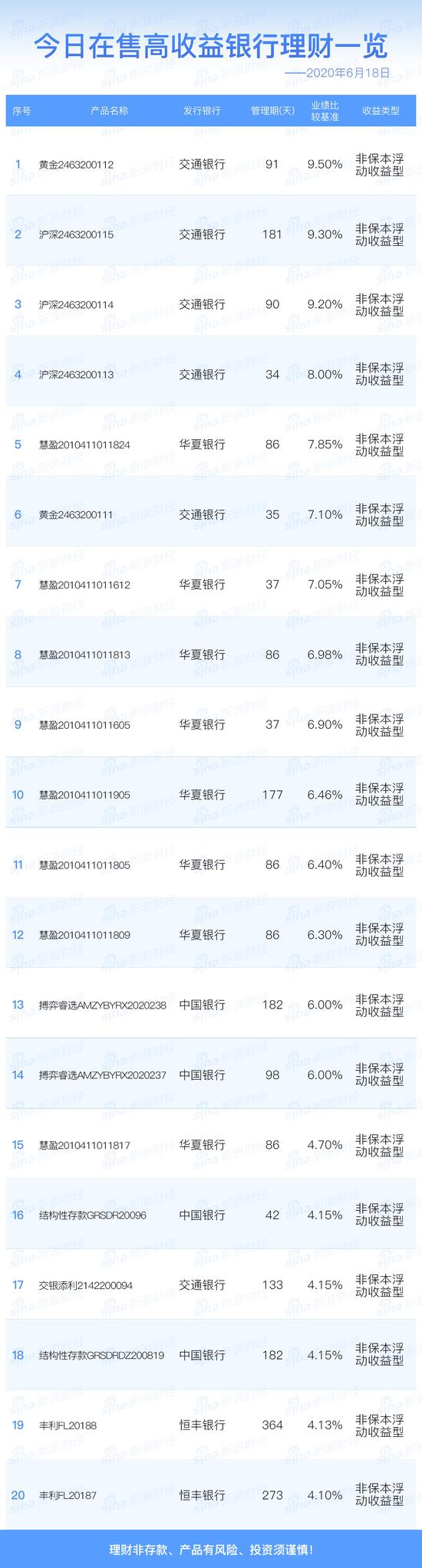 银行6月18日在售高收益理财产品