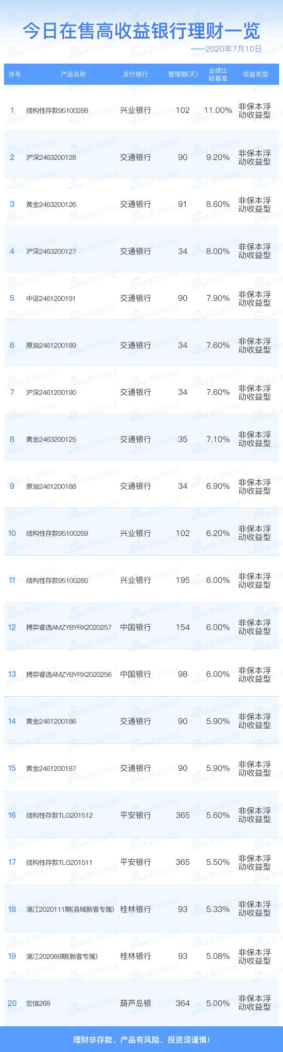 银行7月10日在售高收益理财产品