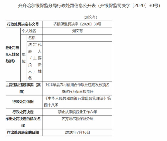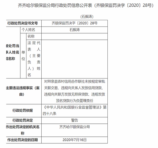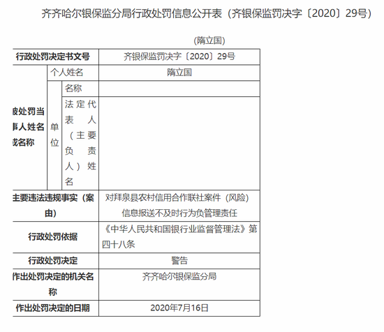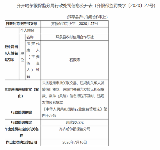 •   新浪财经讯 7月23日消息,齐齐哈尔银保监分局公布的行政处罚信息公开表显示,拜泉县农村信用合作联社因未按规定审批关联交易、违规向关系人发放信用贷款、违规向关联方发放无担保贷款、案件(风险)信息报送不及时、违规发放顶名贷款等违法违规行为,被处罚款80万元。同时,公司法人石振涛因对拜泉县农村信用合作联社未按规定审批关联交易、违规向关系人发放信用贷款、违规向关联方发放无担保贷款、违规发放顶名贷款行为负管理责任,受到警告处分;隋立国因对拜泉县农村信用合作联社案件(风险)信息报送不及时行为负管理责任,受到警告处分;刘文有因对拜泉县农村信用合作联社违规发放顶名贷款行为负直接责任,被禁止从事银行业工作六年。