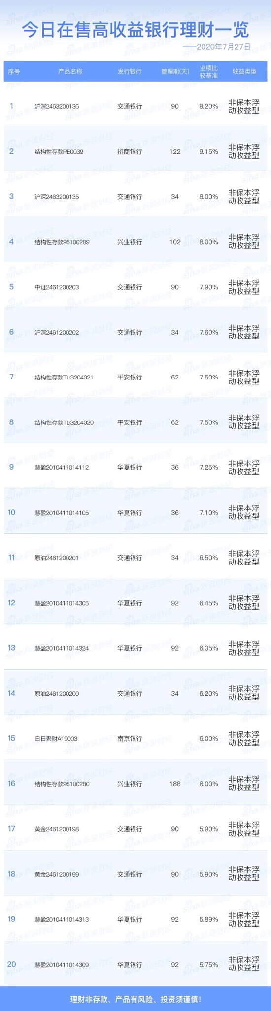 银行7月27日在售高收益理财产品
