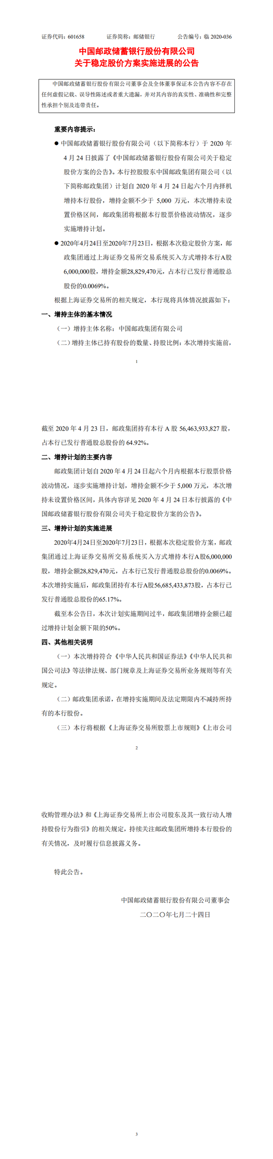邮储银行:控股股东邮政集团增持比例达到1%