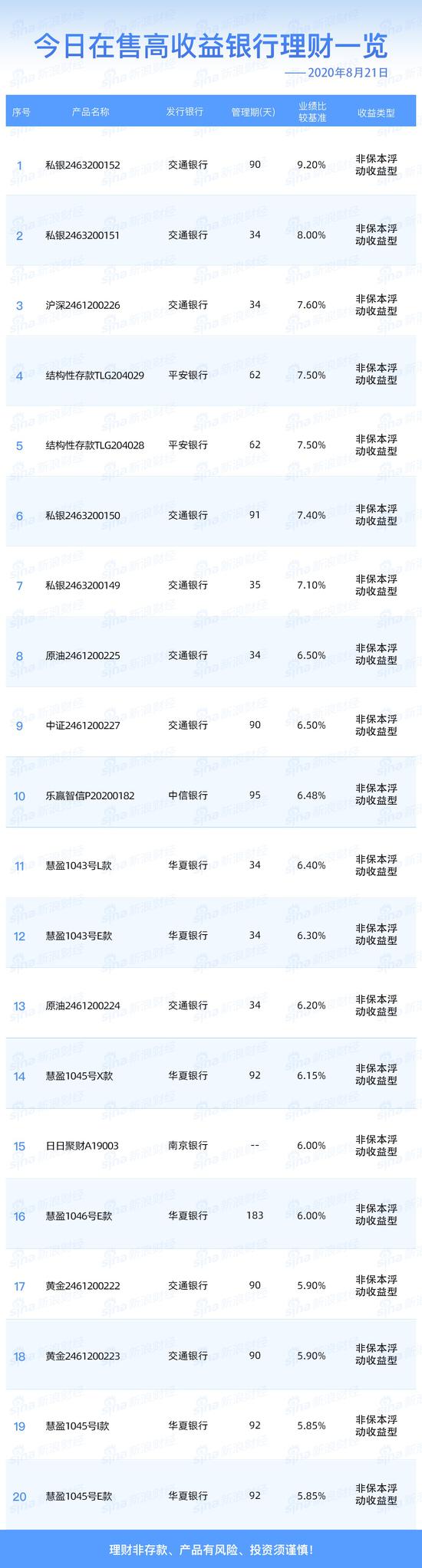 •   新浪财经8月21日在售高收益银行理财产品:今日业绩比较基准在7.00%及以上的银行人民币理财产品共7款。交通银行的“私银2463200152”业绩比较基准最高,为9.20%。