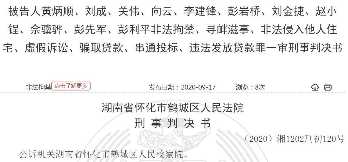 鹤城区人民法院一审判决,以非法拘禁等罪名判处黄某顺团伙成员有期徒刑1年半至8年不等,其中,关某、向某二人均涉非法拘禁罪、违法发放贷款罪,分别获刑有期徒刑3年、有期徒刑2年半。