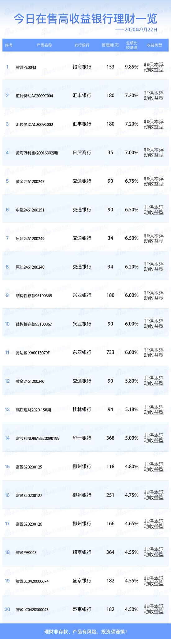•   9月22日在售高收益银行理财产品:今日业绩比较基准在7.00%及以上的银行人民币理财产品共4款。招商银行的“银和理财之人民币岁月流金180天理财”业绩比较基准最高,为9.85%。