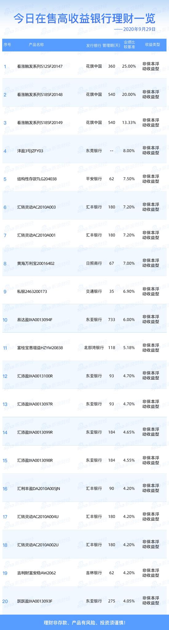 •   9月29日在售高收益银行理财产品:今日业绩比较基准在7.00%及以上的银行人民币理财产品共8款。花旗中国的“看涨触发系列S12SF20147”业绩比较基准最高,为25%。