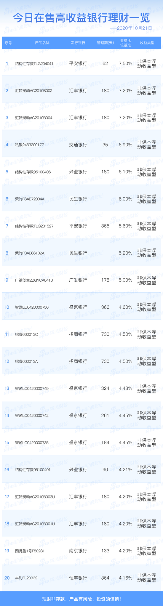 银行21日在售高收益理财产品一览 2019年11月21日10时53分
