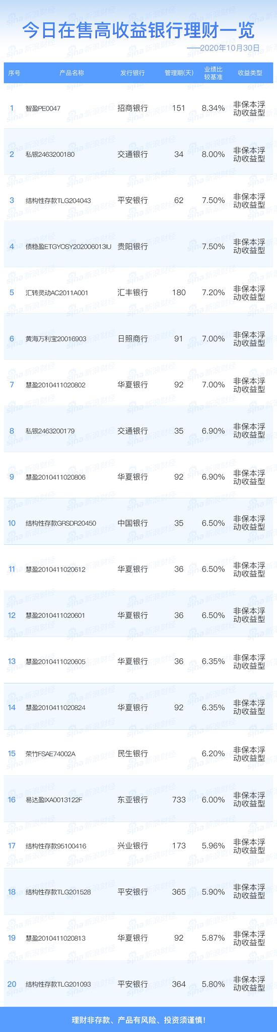 银行30日在售高收益理财产品一览 2019年10月30日09时04分