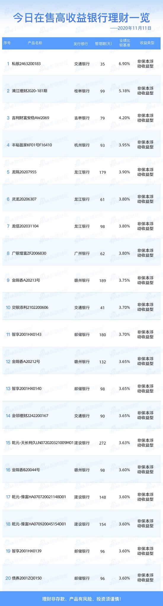 银行11日在售高收益理财产品一览