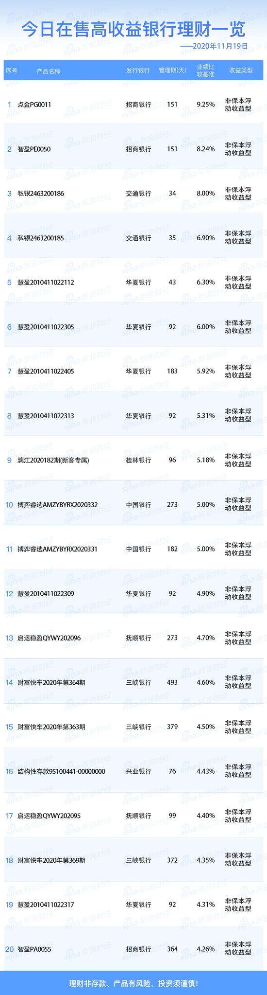 银行19日在售高收益理财产品一览
