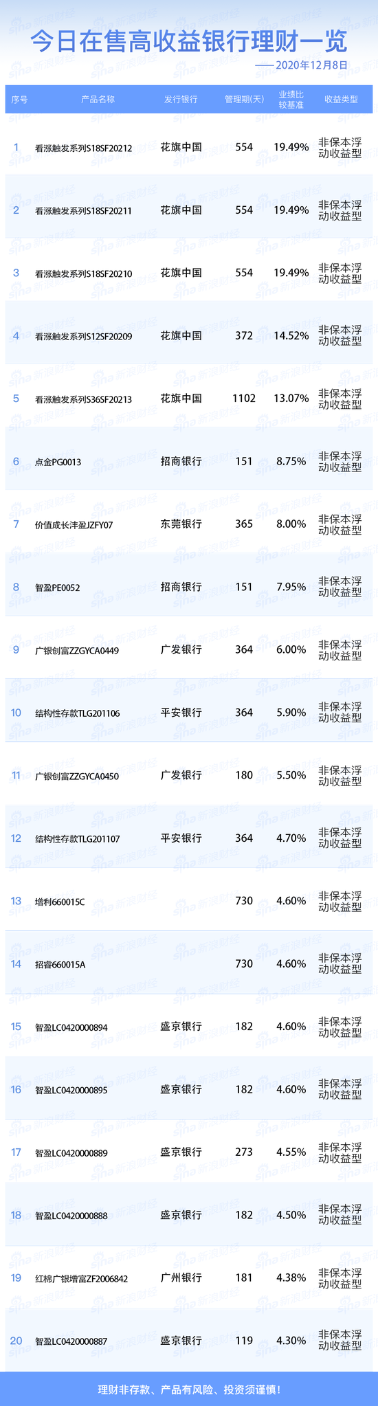 •   12月8日在售高收益银行理财产品:今日业绩比较基准在8%以上的银行人民币理财产品共7款。花旗中国“看涨触发系列S18SF20212”业绩比较基准最高,为19.49%。