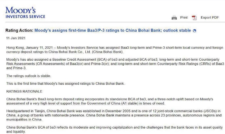穆迪:确认渤海银行“Baa3”长期存款评级