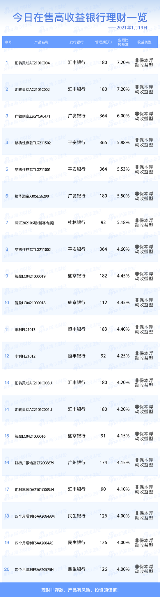 银行1月19日在售高收益理财产品