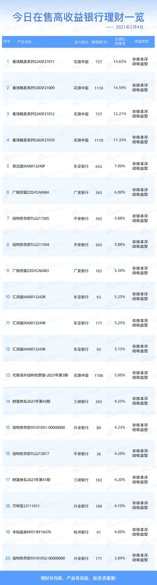 •   新浪财经2月4日在售高收益银行理财产品:今日业绩比较基准在6%以上的银行人民币理财产品共6款。花旗中国“看涨触发系列S24SF21011”业绩比较基准最高,为14.65%。