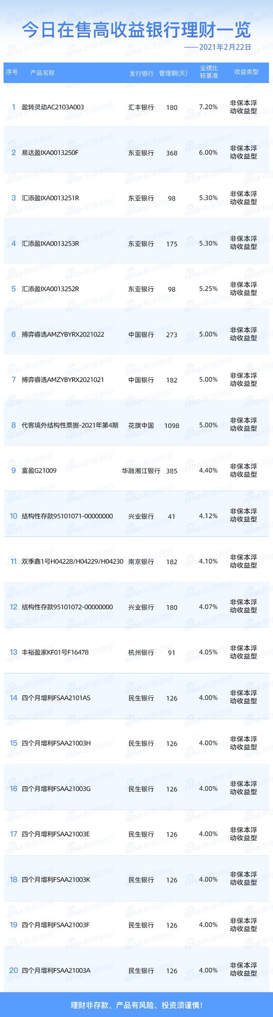 银行2月22日在售高收益理财产品