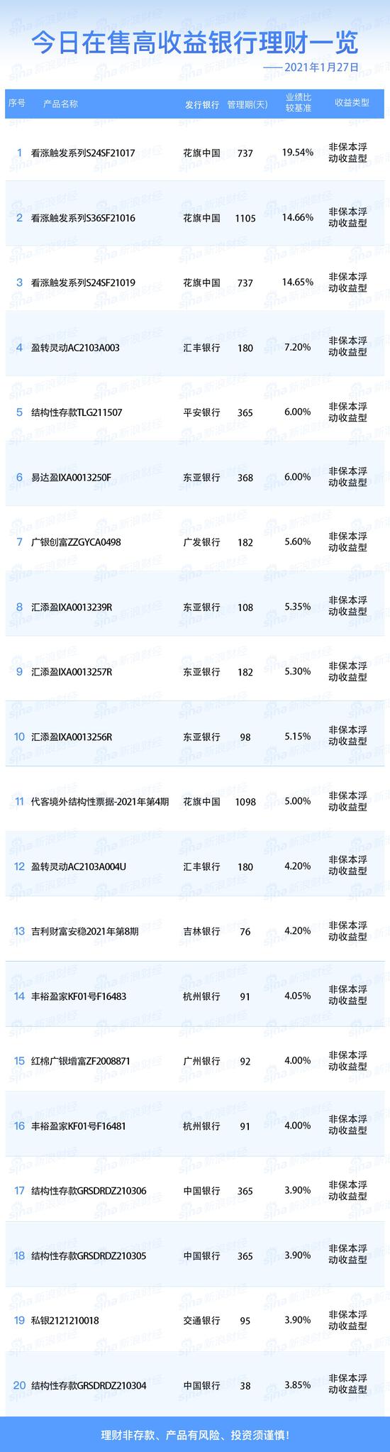 •   2月24日在售高收益银行理财产品:今日业绩比较基准在6%以上的银行人民币理财产品共6款。花旗中国“看涨触发系列S24SF21017”业绩比较基准最高,为19.54%。