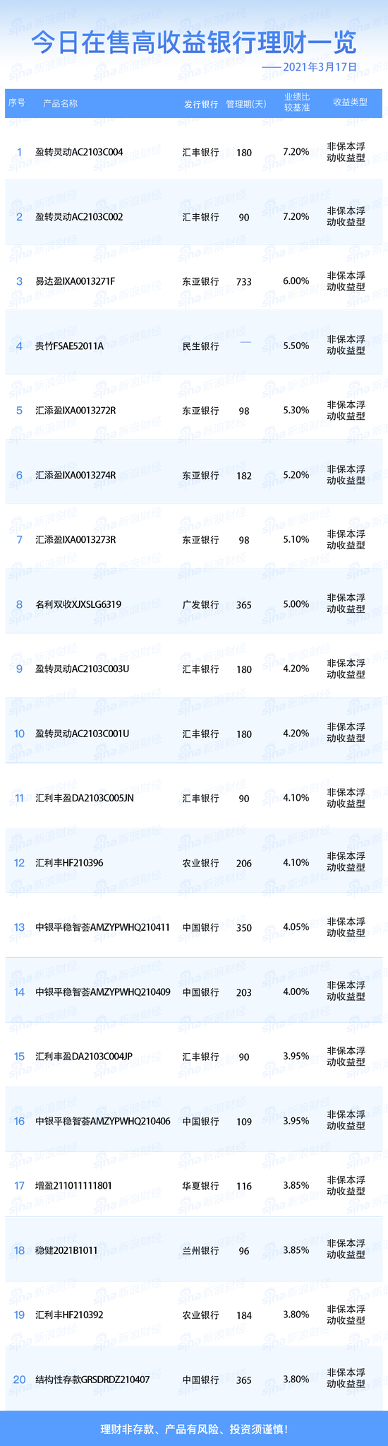 •   新浪财经3月15日在售高收益银行理财产品:今日业绩比较基准在6%以上的银行人民币理财产品共3款。汇丰银行“盈转灵动AC2103C004”业绩比较基准最高,为7.2%。