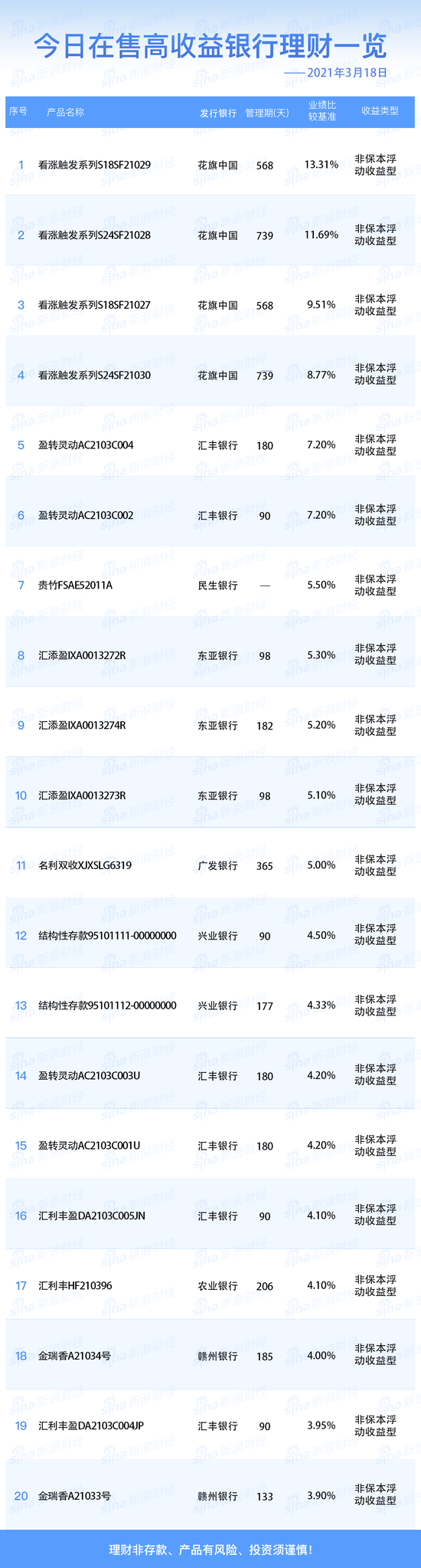 银行3月18日在售高收益理财产品