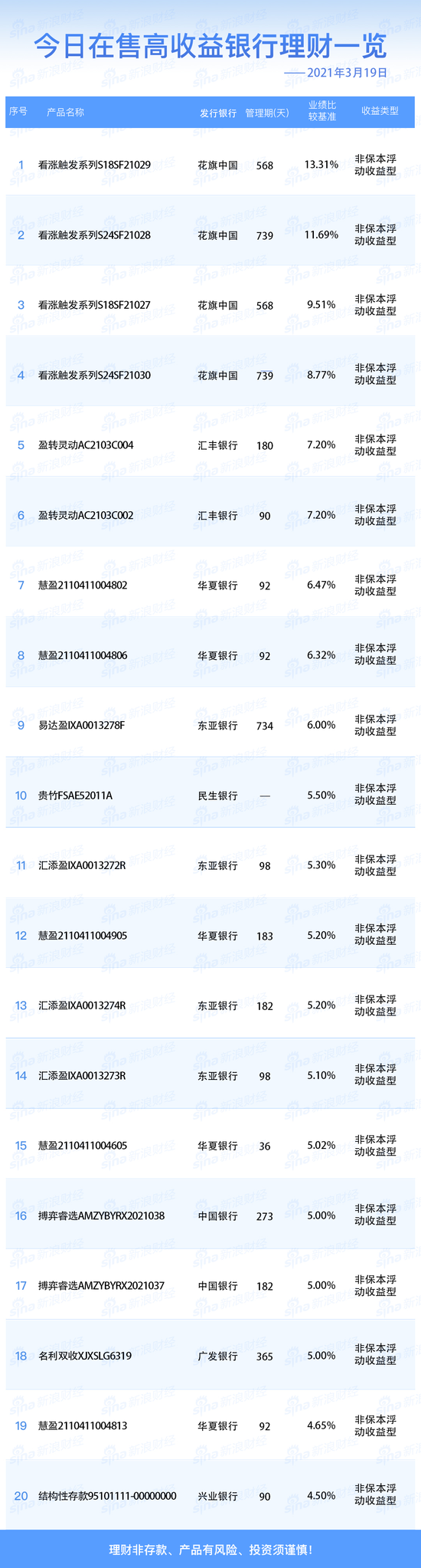 •   3月19日在售高收益银行理财产品:今日业绩比较基准在7%以上的银行人民币理财产品共6款。花旗中国“看涨触发系列S18SF21029”业绩比较基准最高,为13.31%。