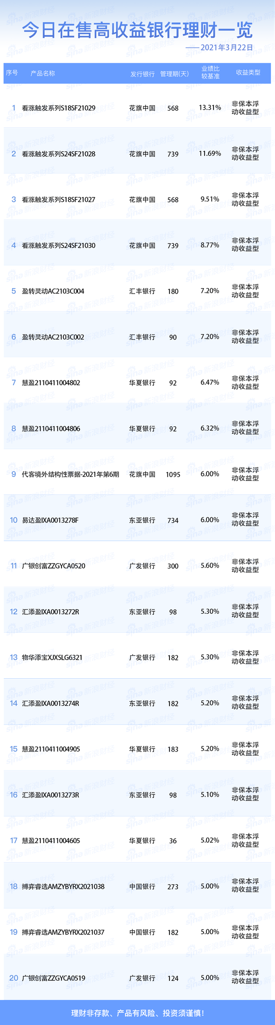 银行3月22日在售高收益理财产品