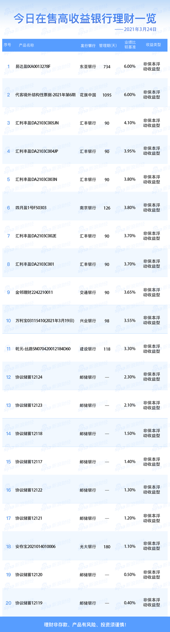 •   新浪财经3月24日在售高收益银行理财产品:今日业绩比较基准在4%以上的银行人民币理财产品共3款。东亚银行“易达盈IXA0013278F”业绩比较基准最高,为6.00%。