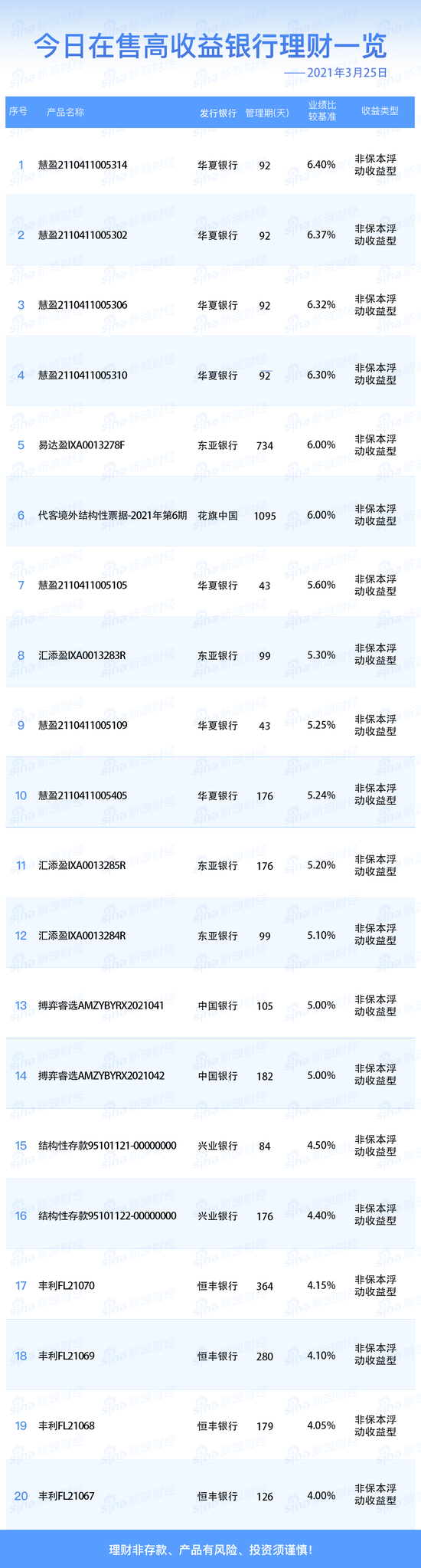 •   新浪财经3月25日在售高收益银行理财产品:今日业绩比较基准在6%以上的银行人民币理财产品共6款。华夏银行“慧盈2110411005314”业绩比较基准最高,为6.40%。
