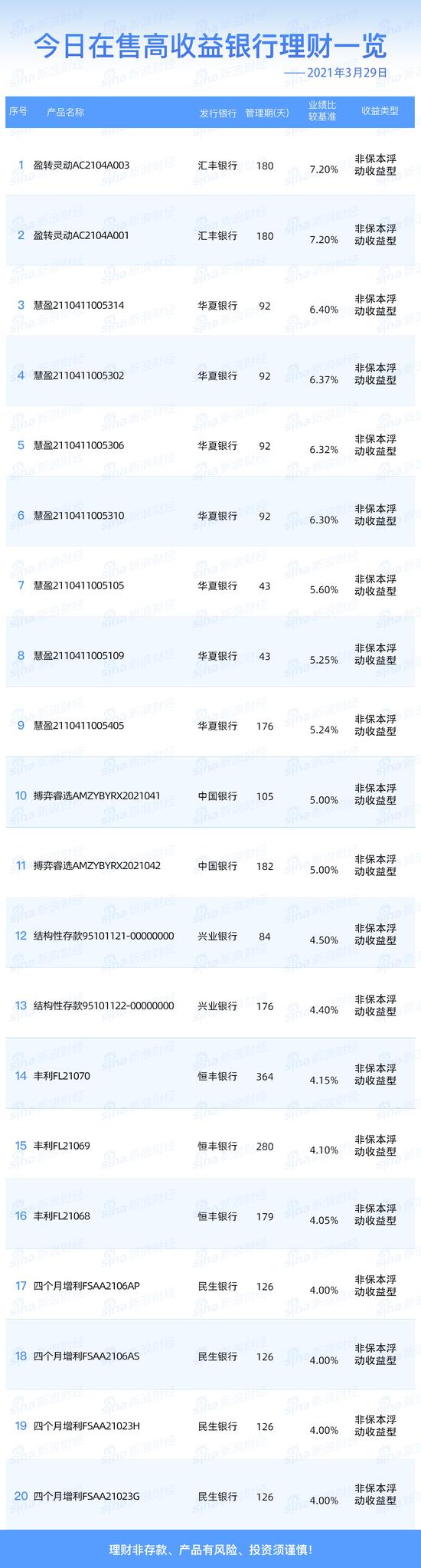 银行3月29日在售高收益理财产品
