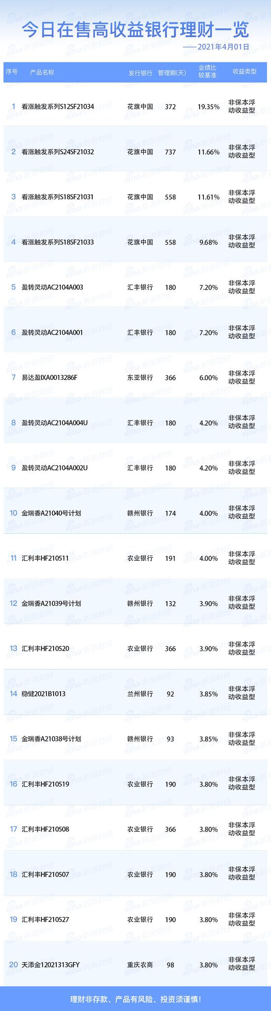 •   新浪财经4月1日在售高收益银行理财产品:今日业绩比较基准在7%以上的银行人民币理财产品共6款。花旗中国“看涨触发系列S12SF21034”业绩比较基准最高,为19.35%。