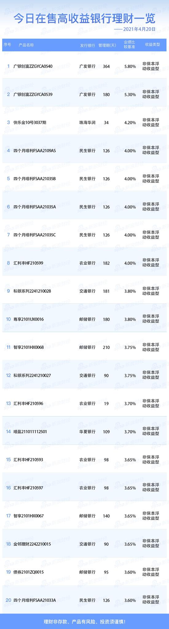 •   新浪财经4月20日在售高收益银行理财产品:今日业绩比较基准在5%以上的银行人民币理财产品共2款。广发银行“广银创富ZZGYCA0540”业绩比较基准最高,为5.80%。
