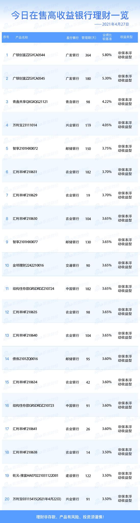 •   新浪财经4月27日在售高收益银行理财产品:今日业绩比较基准在4%以上的银行人民币理财产品共4款。广发银行“广银创富ZZGYCA0544”业绩比较基准最高,为5.80%。