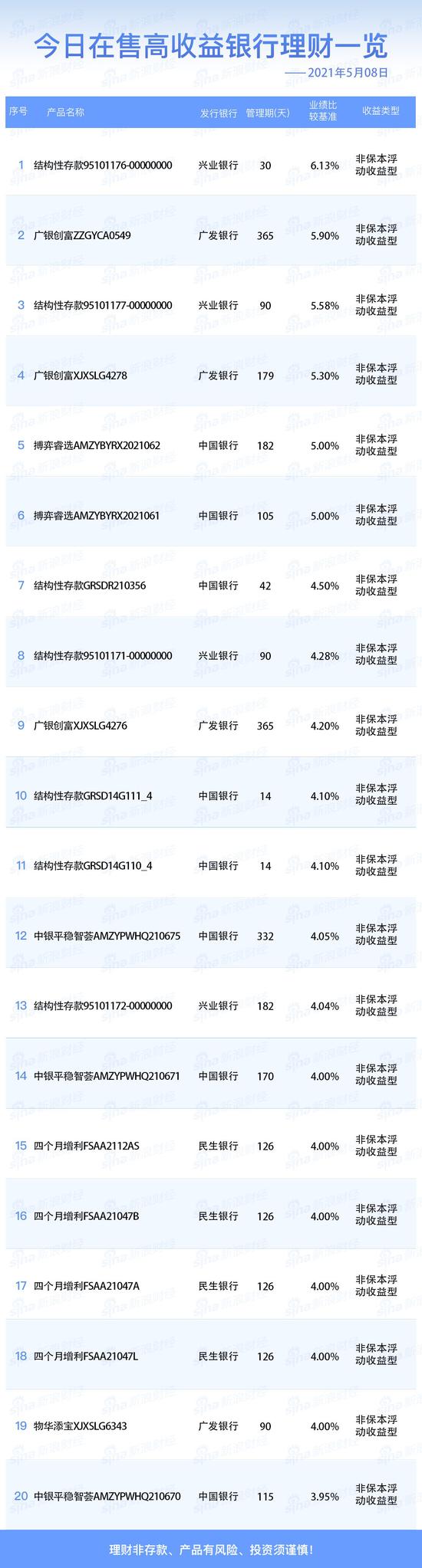 •   新浪财经5月8日在售高收益银行理财产品:今日业绩比较基准在5%以上的银行人民币理财产品共6款。兴业银行“结构性存款95101176-00000000”业绩比较基准最高,为6.13%。