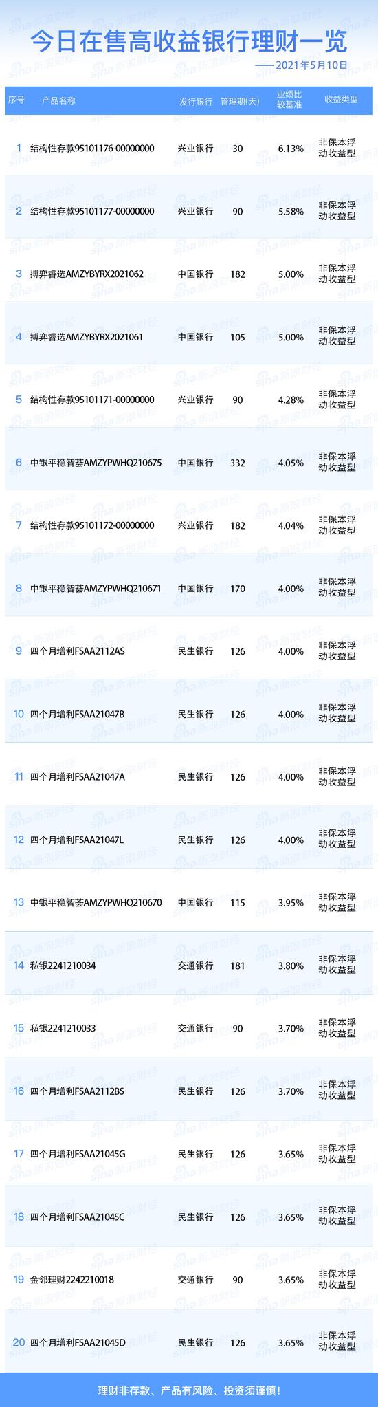 •   新浪财经5月10日在售高收益银行理财产品:今日业绩比较基准在5%以上的银行人民币理财产品共4款。兴业银行“结构性存款95101176-00000000”业绩比较基准最高,为6.13%。