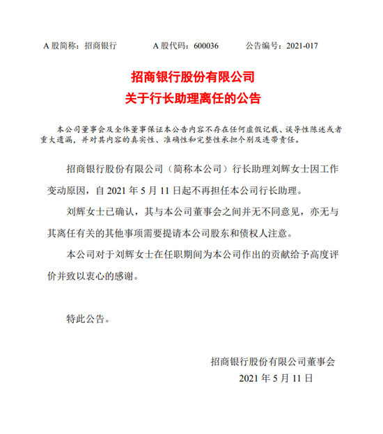 招商银行:免去田惠宇行长职务,另有任用