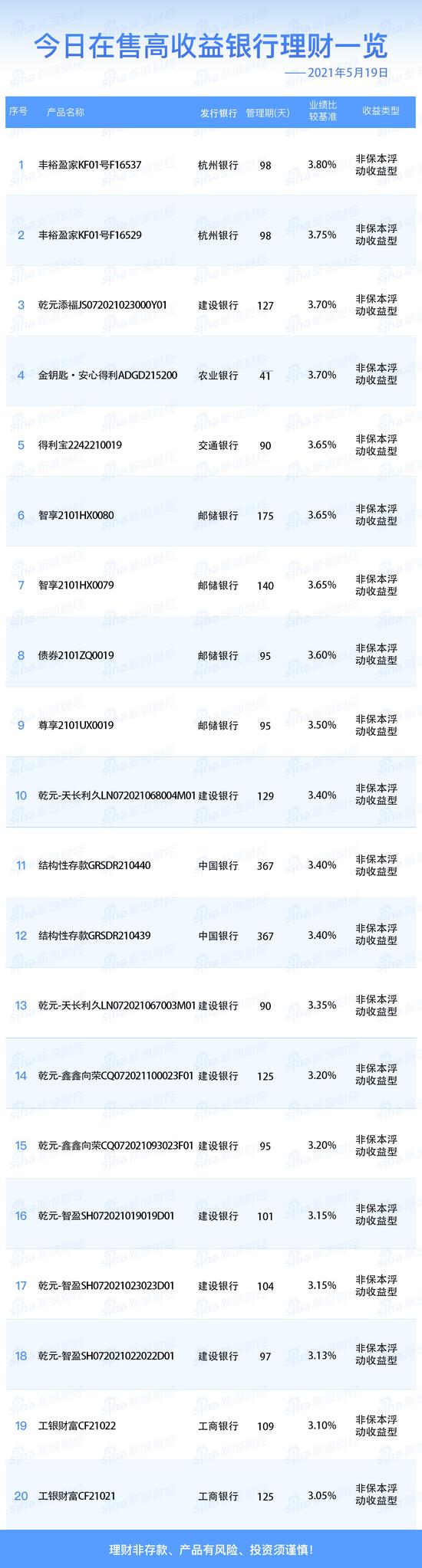 银行5月19日在售高收益理财产品