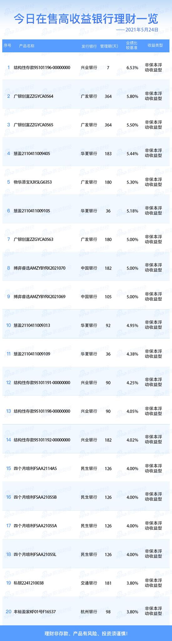 银行5月24日在售高收益理财产品