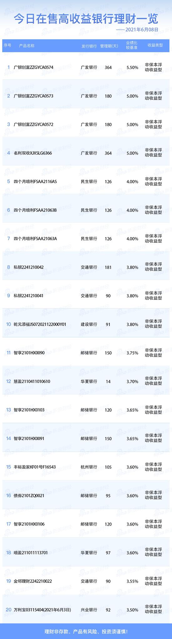 •   新浪财经6月8日在售高收益银行理财产品:今日业绩比较基准在5.0%以上的银行人民币理财产品共4款。广发银行的“广银创富ZZGYCA0574”业绩比较基准最高,为5.50%。