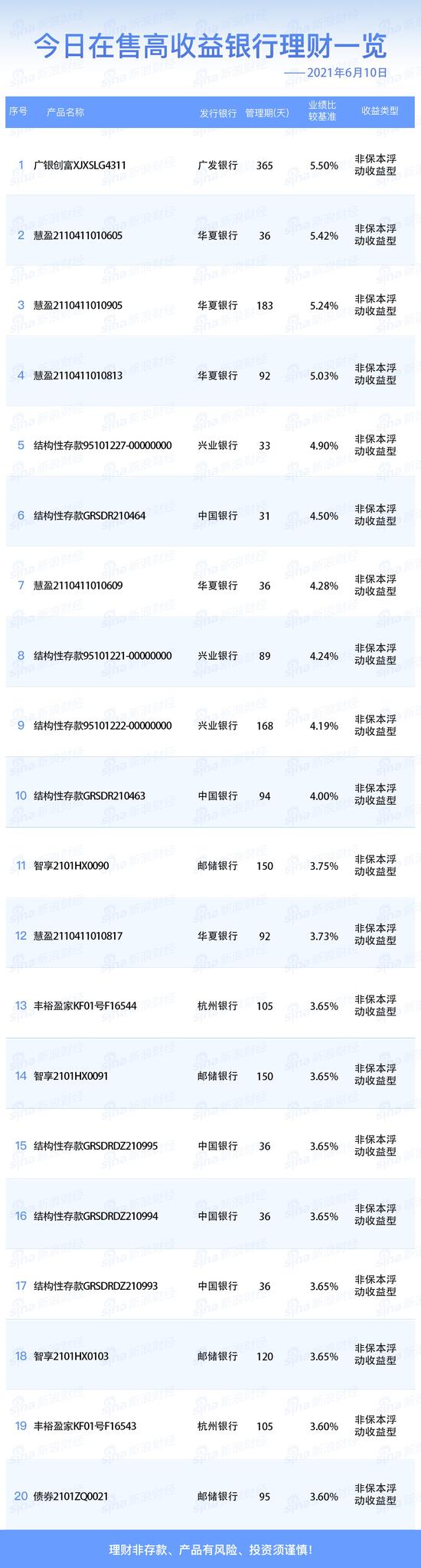 银行6月10日在售高收益理财产品