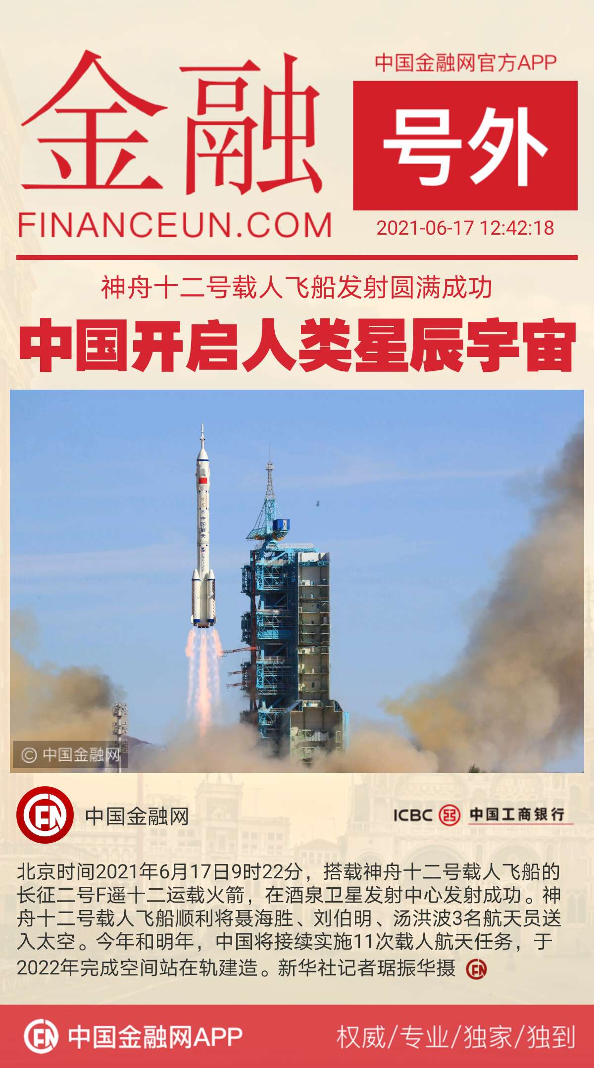 北京时间2021年6月17日9时22分,搭载神舟十二号载人飞船的长征二号F遥十二运载火箭,在酒泉卫星发射中心发射成功。神舟十二号载人飞船顺利将聂海胜、刘伯明、汤洪波3名航天员送入太空。今年和明年,中国将接续实施11次载人航天任务,于2022年完成空间站在轨建造。