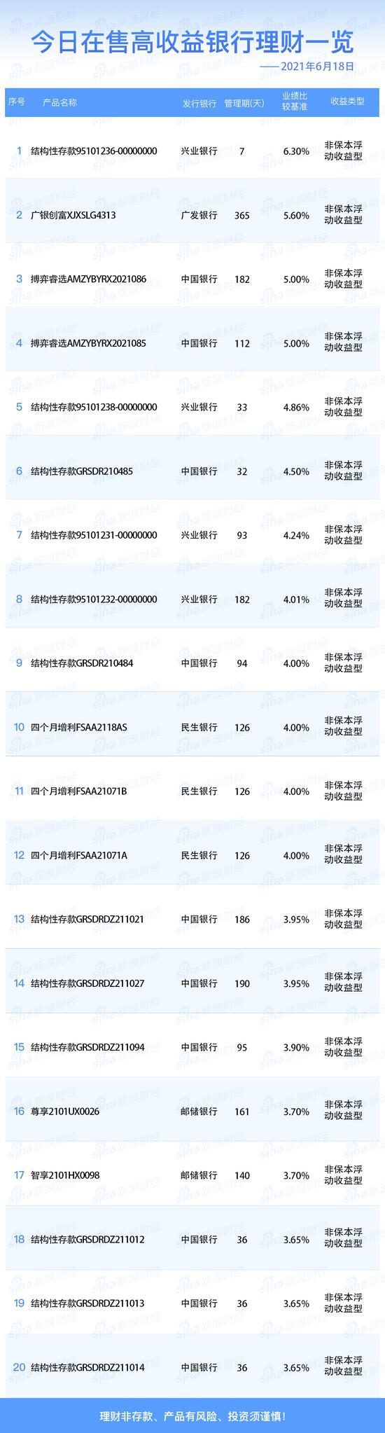 •   新浪财经6月18日在售高收益银行理财产品:今日业绩比较基准在4.5%以上的银行人民币理财产品共6款。兴业银行的“结构性存款95101236-00000000”业绩比较基准最高,为6.3%。