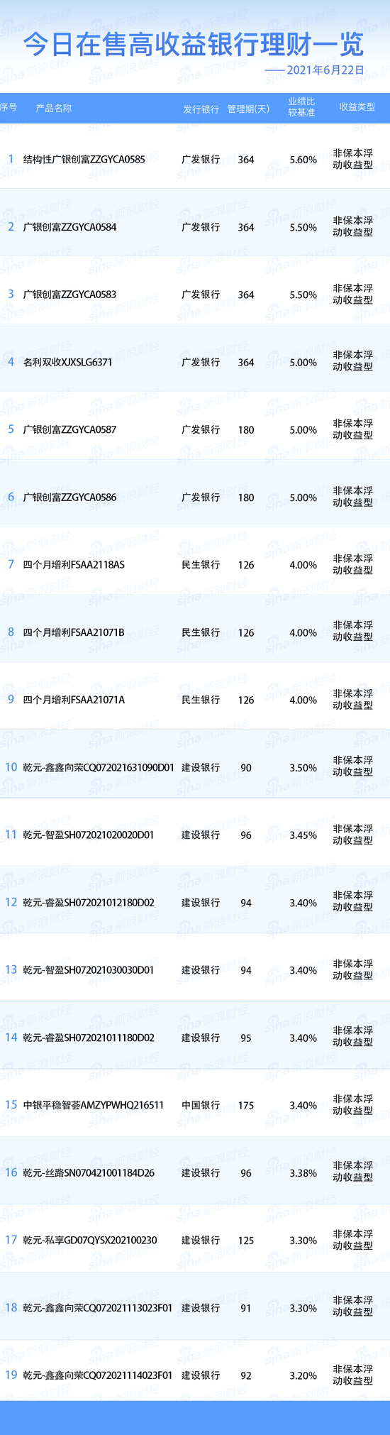 •   新浪财经6月22日在售高收益银行理财产品:今日业绩比较基准在4.5%以上的银行人民币理财产品共6款。广发银行的“广银创富ZZGYCA0585”业绩比较基准最高,为5.6%。