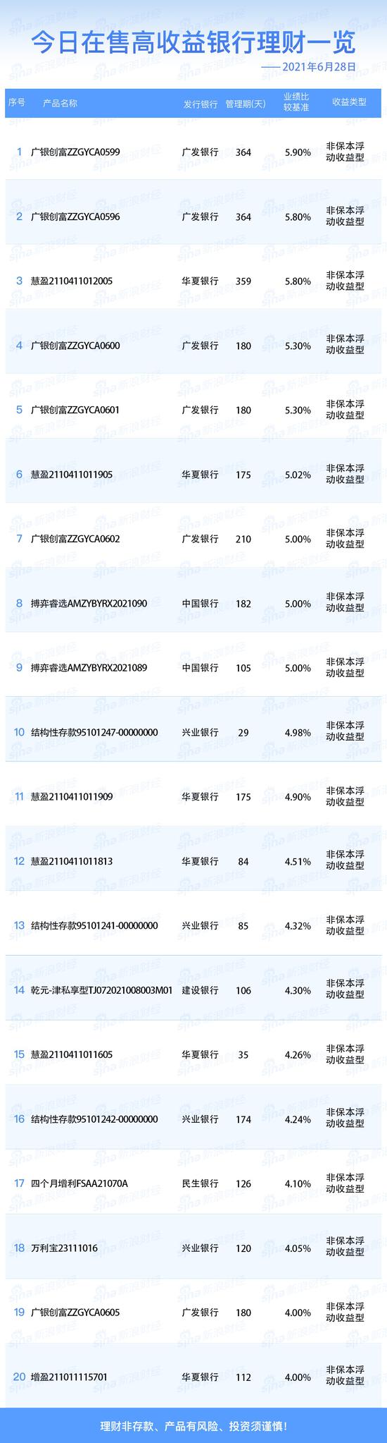 •   新浪财经6月28日在售高收益银行理财产品:今日业绩比较基准在5%以上的银行人民币理财产品共9款。广发银行的“广银创富ZZGYCA0599”业绩比较基准最高,为5.02%。