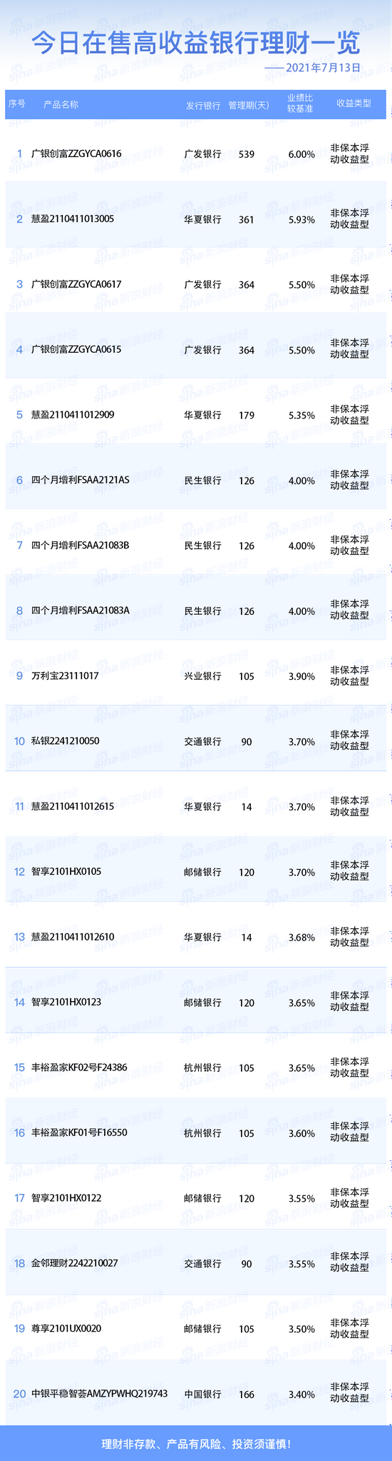 银行7月13日在售高收益理财产品