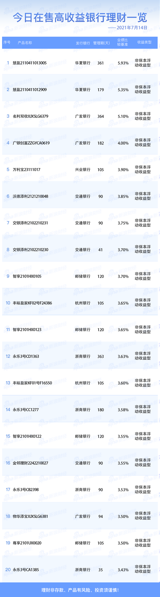 新浪财经7月14日在售高收益银行理财产品:今日业绩比较基准在5.10%以上的银行人民币理财产品共3款。华夏银行的“慧盈2110411013005”、华夏银行的“慧盈2110411012909”业绩比较基准最高,为5.93和5.35%%。