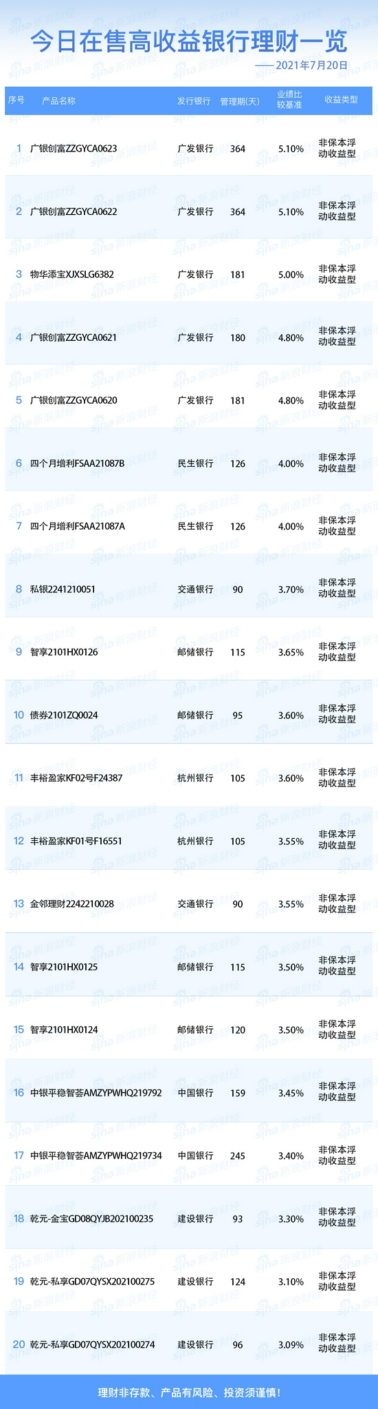 银行7月20日在售高收益理财产品